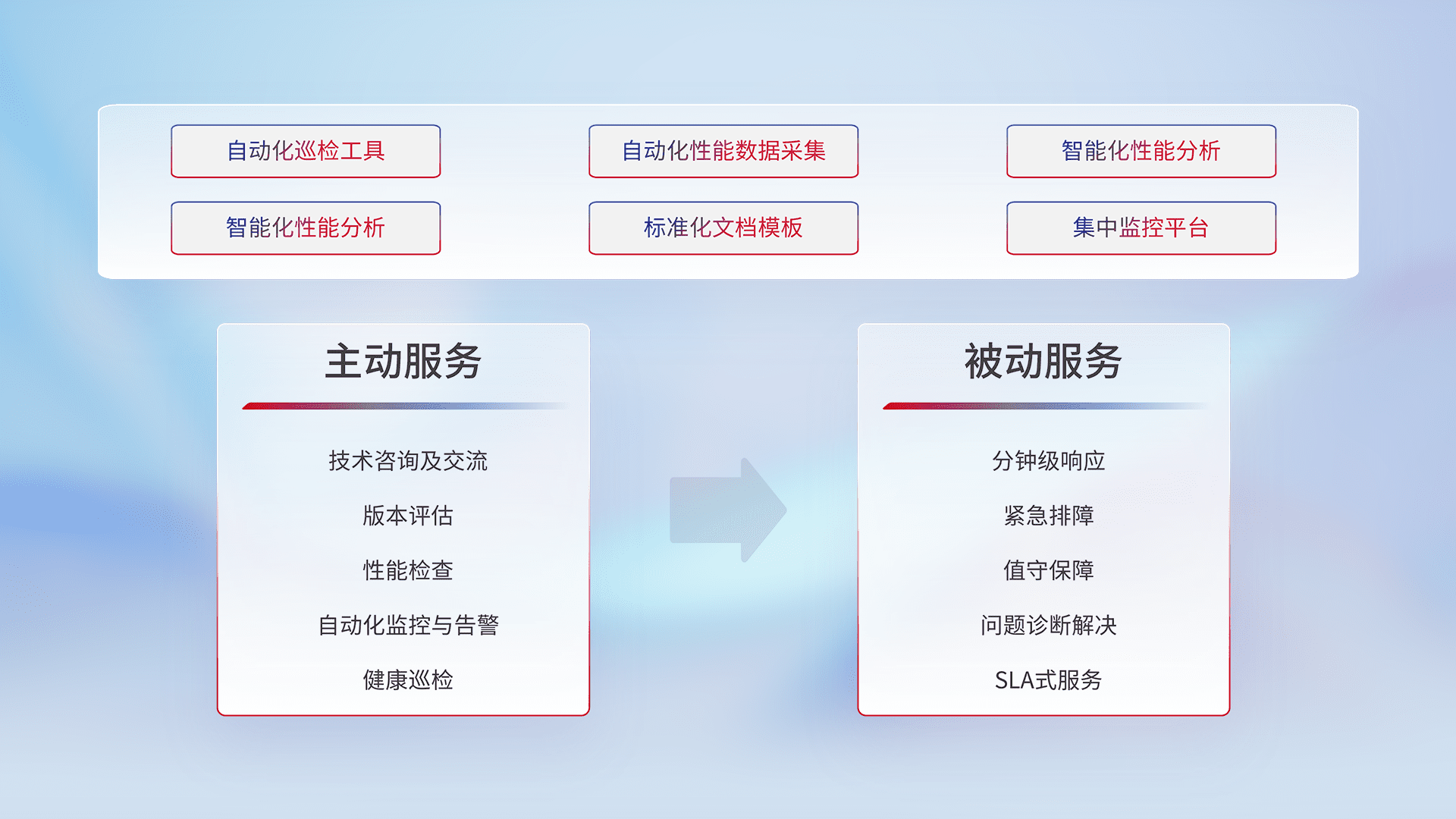 智能化工具和标准化文档,,,保障服务质量,,提供主动服务(包含技术咨询、、版本评估、、、性能检查、、、、自动化监控与告警、、、、健康巡检)和被动服务包含(分钟级响应、、、、紧急排障、、、值守保障、、、、问题诊断解决、、SLA服务)。。。